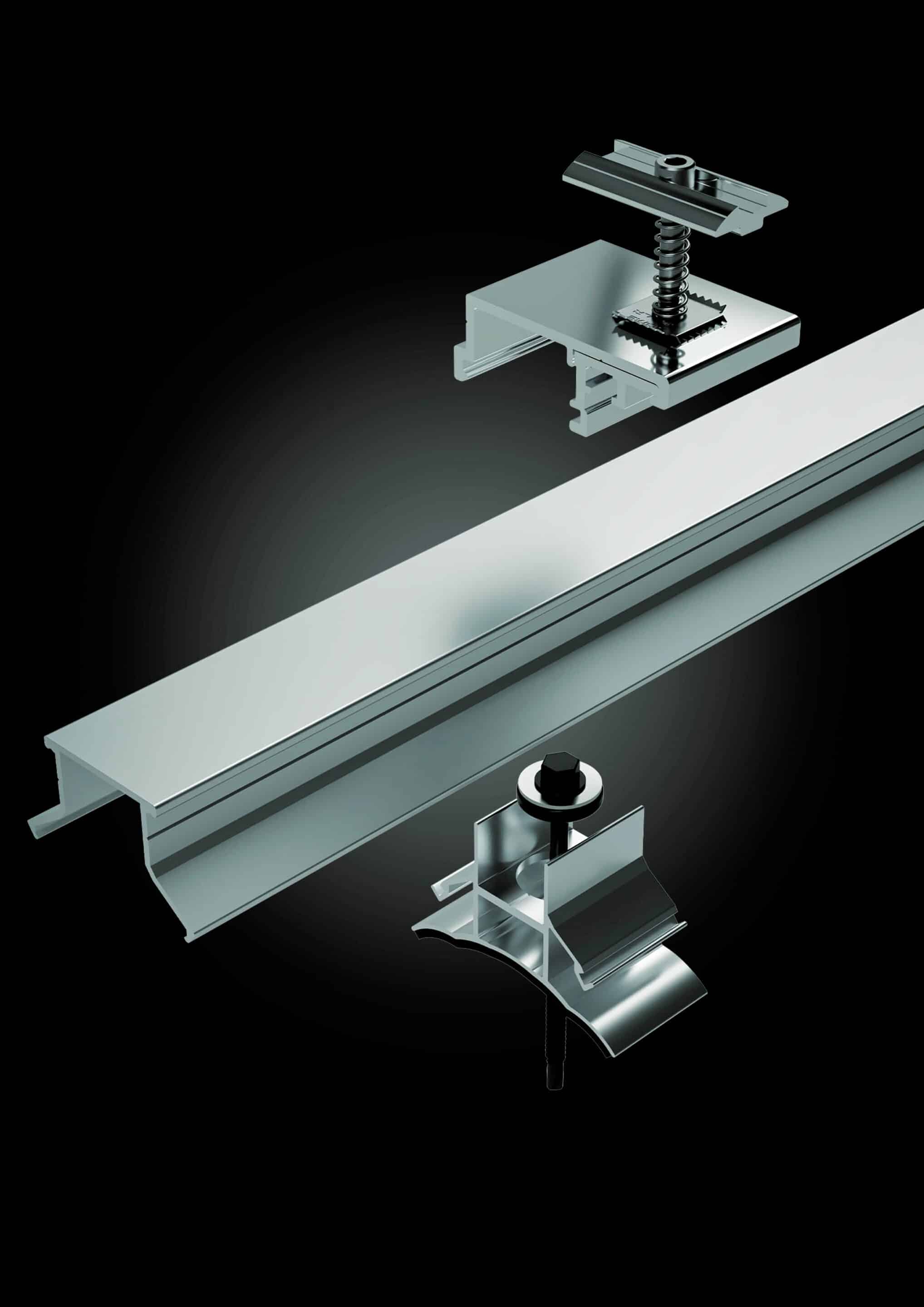 | COMPOSANTS DU SYSTÈME | Rail abouté aluminium 6060 Support de rail et éclisse aluminium 6060 + joint PVC Fixation universelle (MALT modules incluse) et fixation extérieure de finition aluminium 6060/inox Connecteur bas de générateur aluminium 6060 Connecteur Terre Rail (CTR) aluminium 6060 Connecteur Terre Module (CTM) aluminium 6060 |