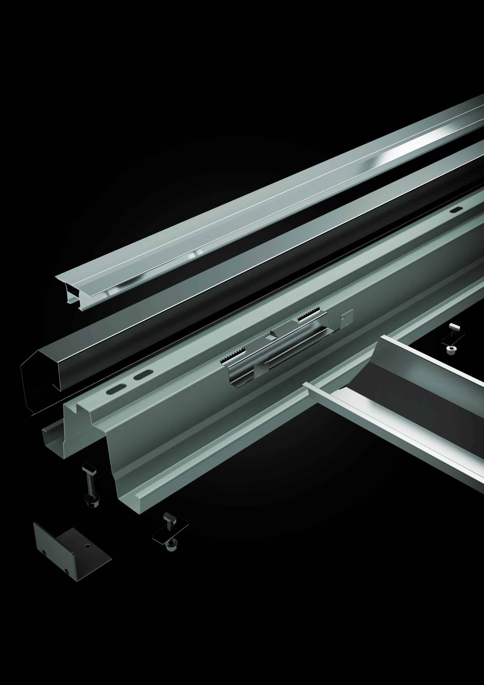 | COMPOSANTS DU SYSTÈME | Rail acier Magnelis® S390 ZM310 Capot aluminium 6060 Traverse et butée acier Magnelis® S390 ZM310 Vis acier |