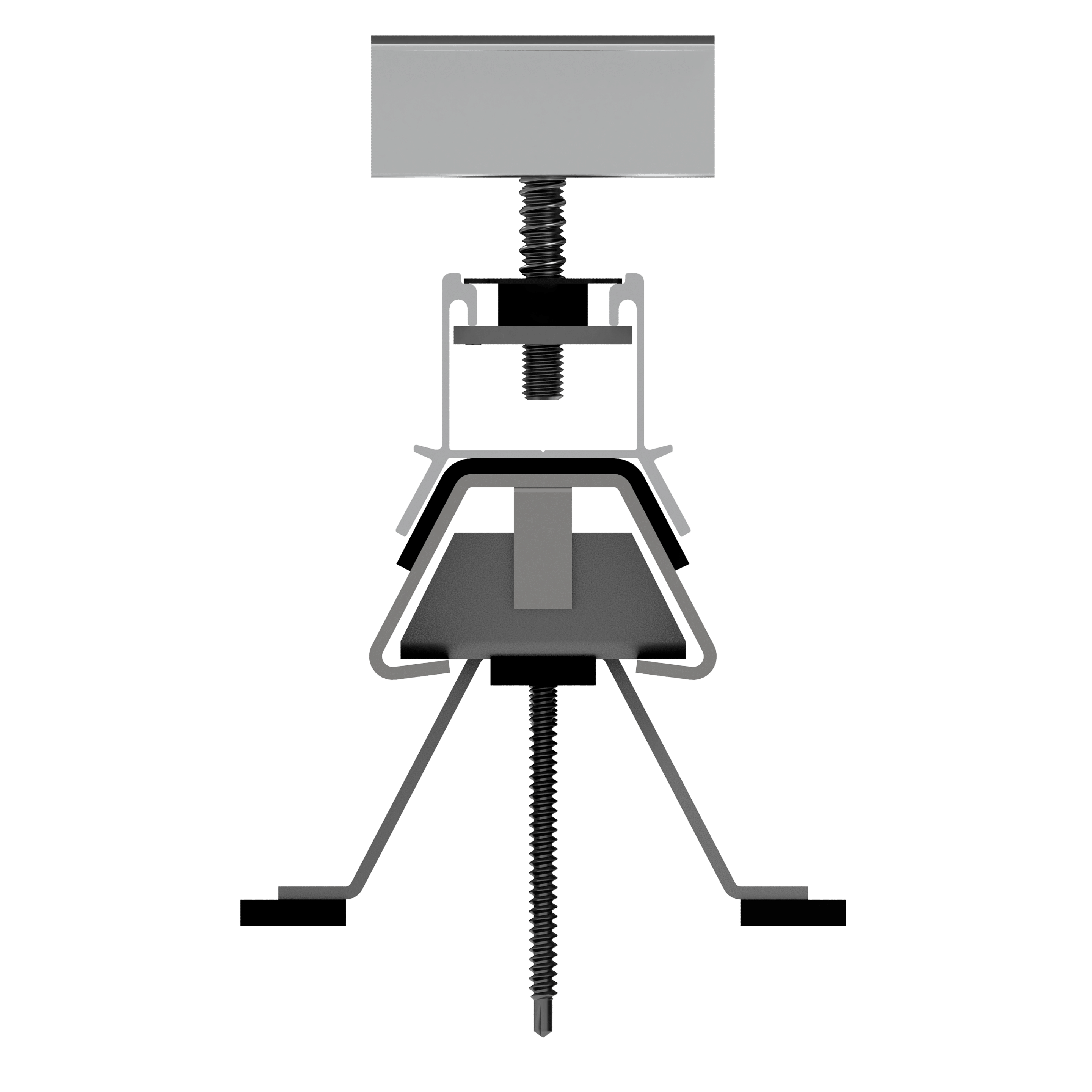 Kogysun + est prévu pour une fixation dans les pannes de l’édifice. Les charges sont réparties uniformément et le bac n’est pas sollicité. De plus, la fixation photovoltaïque Kogysun + n’exige aucun percement supplémentaire dans le bac. Ce système de fixation se reprend au même endroit que le tirefond qui maintient le bac à la panne.