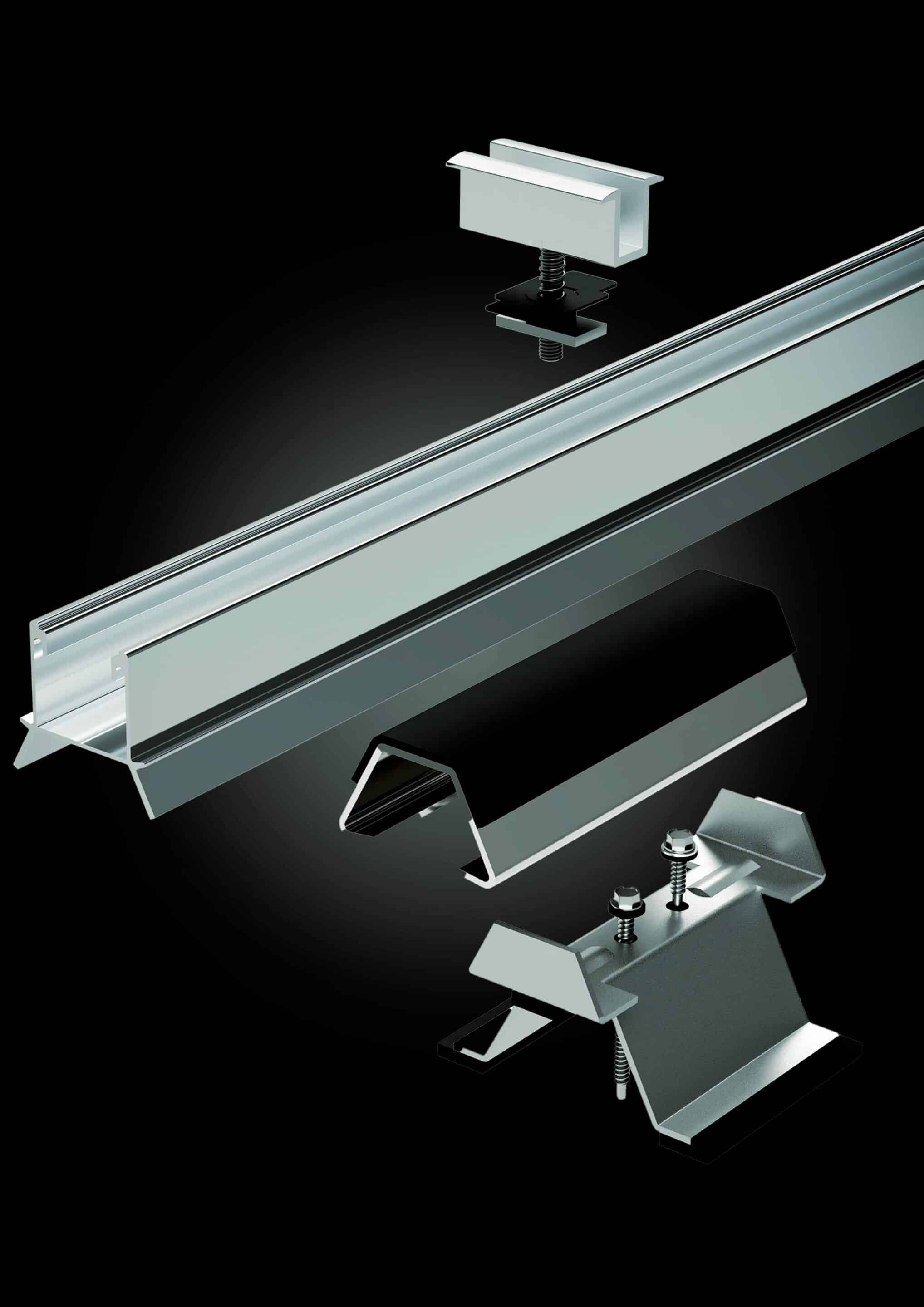 | COMPOSANTS DU SYSTÈME | Rail en aluminium, support de rail en acier + joint EPDM et pince en aluminium |
