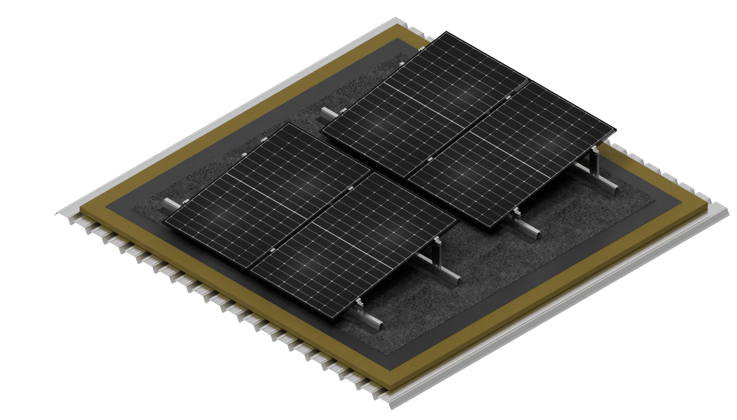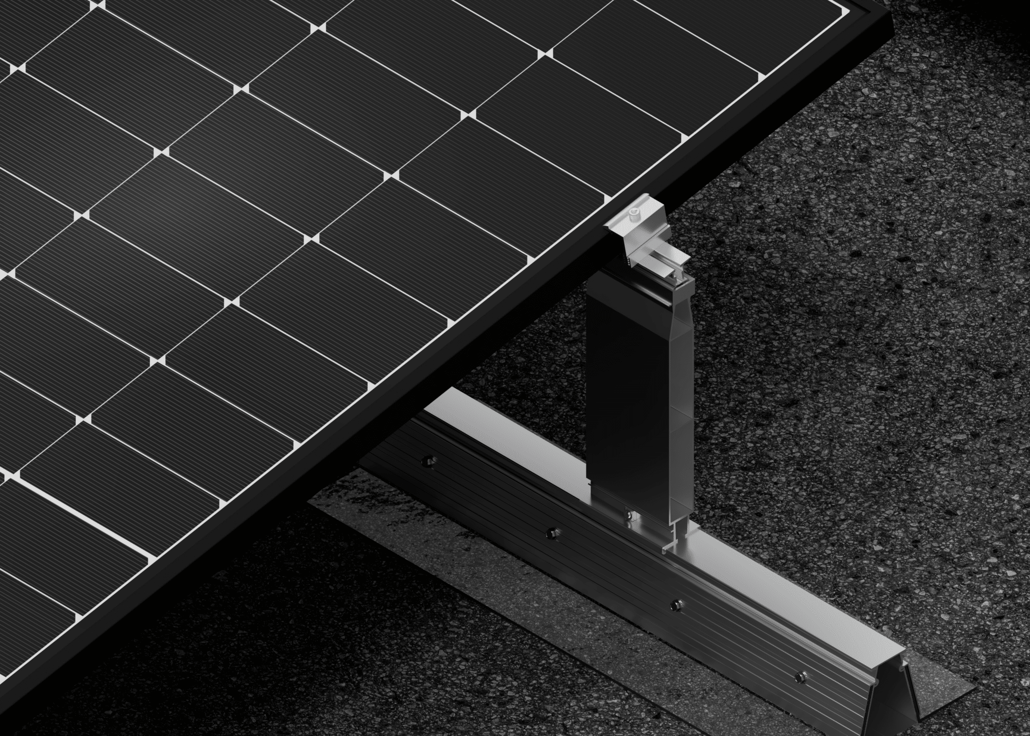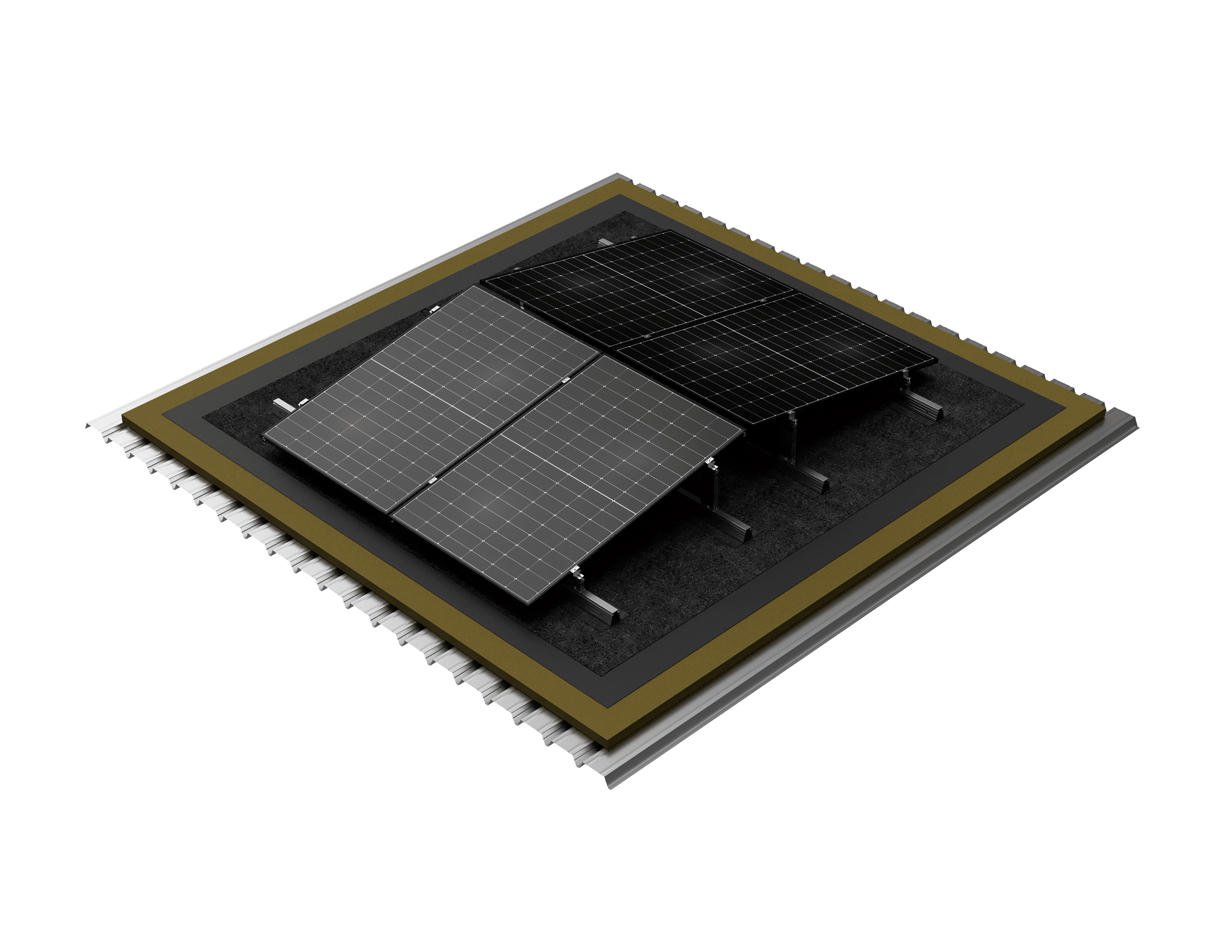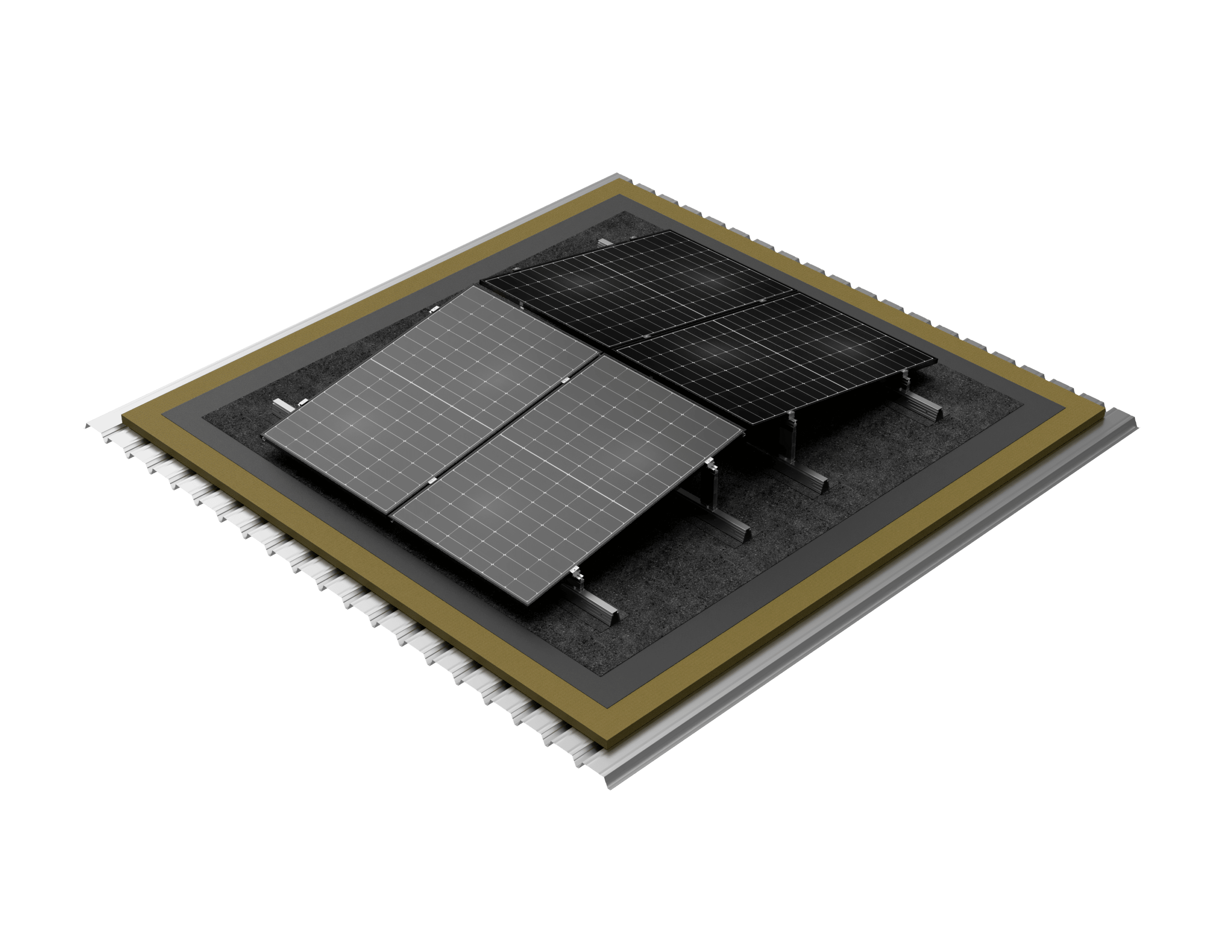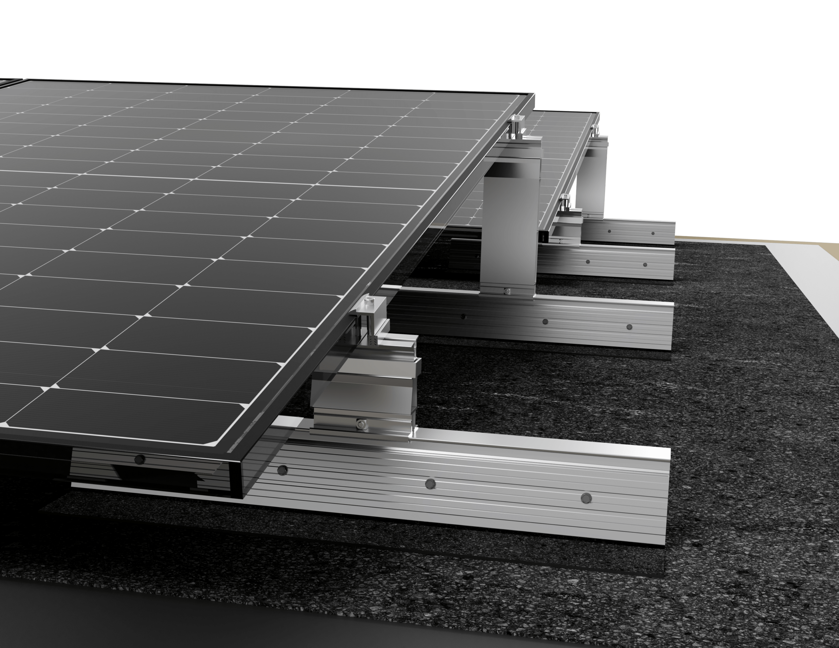 Roof-Solar Bitume Incliné est un système de fixation photovoltaïque pour la pose de panneaux photovoltaïques sur toitures terrasses. Il est dédié aux bâtiments dont la toiture est composée d’une étanchéité bitumineuse. Sans lestage ni perforation de la membrane, la pose de panneaux photovoltaïques n’en est que facilité.