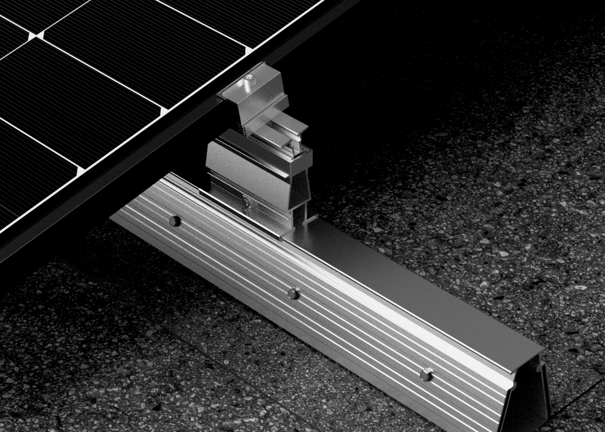 Les rails des systèmes de montage photovoltaïque Roof-Solar Bitumen et Roof-Solar Tilted Bitumen sont soudés à chaud (en savoir plus sur les étapes ici) à la membrane bitumineuse. Une fois les pinces externes puis les pinces universelles clipsées, les panneaux photovoltaïques peuvent être installés. Grâce à la technique de soudage à chaud, aucun lest n’a besoin d’être ajouté sur le toit du bâtiment, ce qui réduit le poids. De plus, la perforation de la membrane n’est pas nécessaire, éliminant ainsi le risque d’infiltration d’eau.