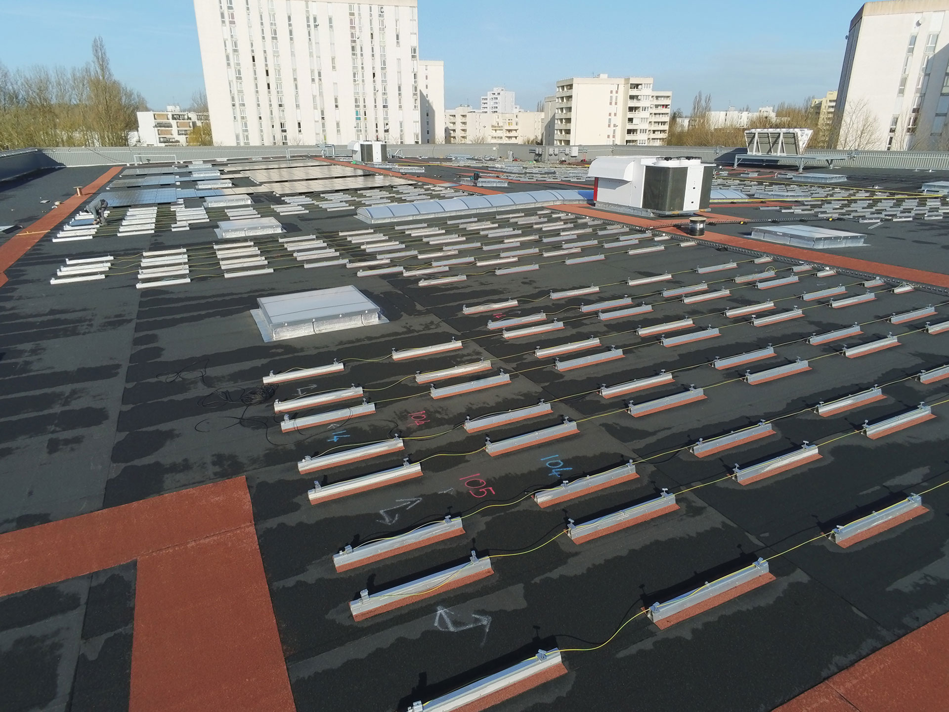 Roof-Solar Bitume permet la pose de panneaux solaires en toiture de sorte à ce que la charge ajoutée sur la structure du bâtiment soit la plus faible possible. Les rails pré-montés avec les bandes de maintien en bitume sont thermo-soudés à la membrane bitumineuse. Aucun lestage n’est donc nécessaire.