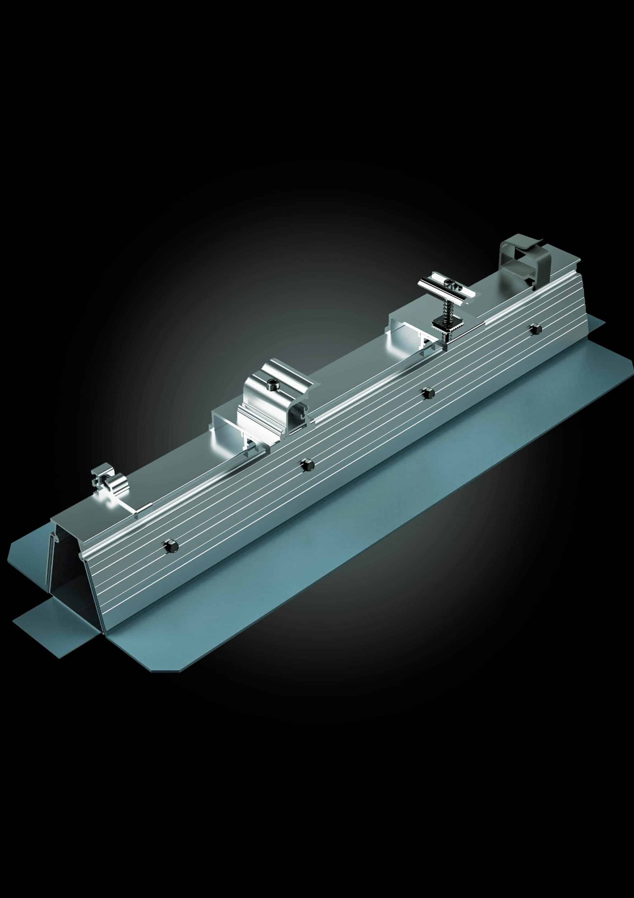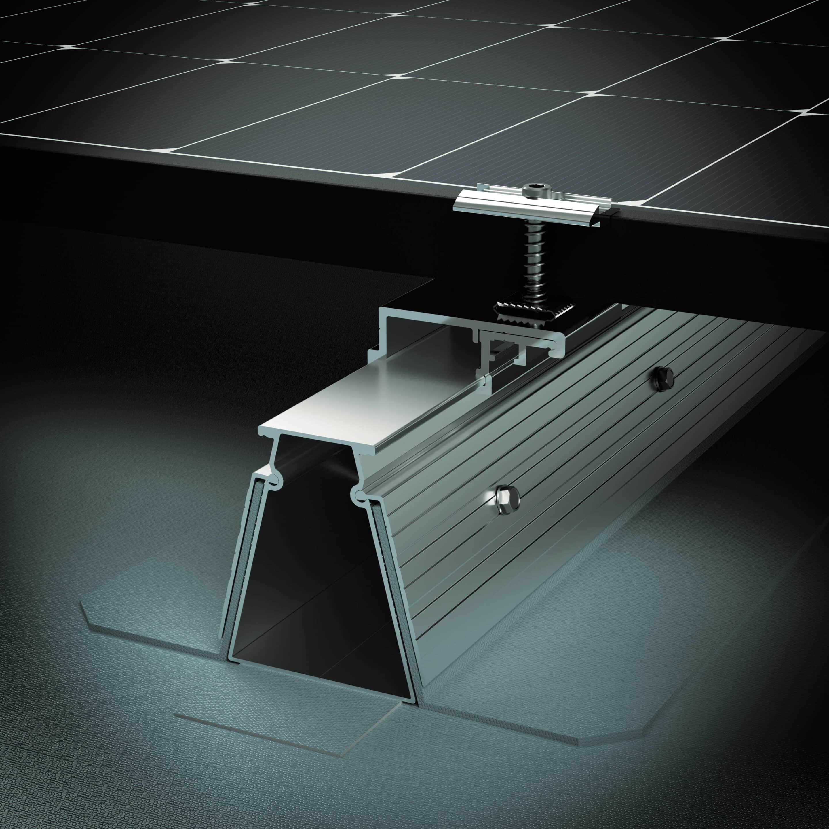 Les rails des systèmes de montage photovoltaïque Roof-Solar PVC et Roof-Solar PVC incliné sont soudés à l’air chaud à la membrane PVC, soit manuellement, soit de manière semi-automatisée. Une fois les pinces externes puis les pinces universelles clipsées, les panneaux photovoltaïques peuvent être installés. Grâce à la technique de soudage à chaud, aucun lest n’a besoin d’être ajouté sur le toit du bâtiment, ce qui réduit le poids. De plus, la perforation de la membrane n’est pas nécessaire, éliminant ainsi le risque d’infiltration d’eau.