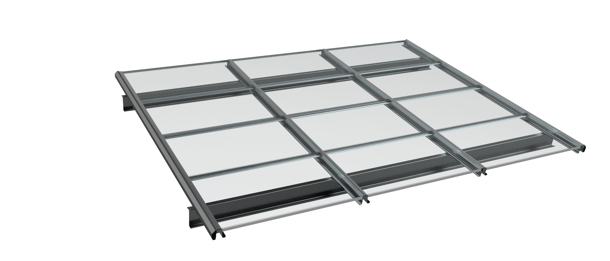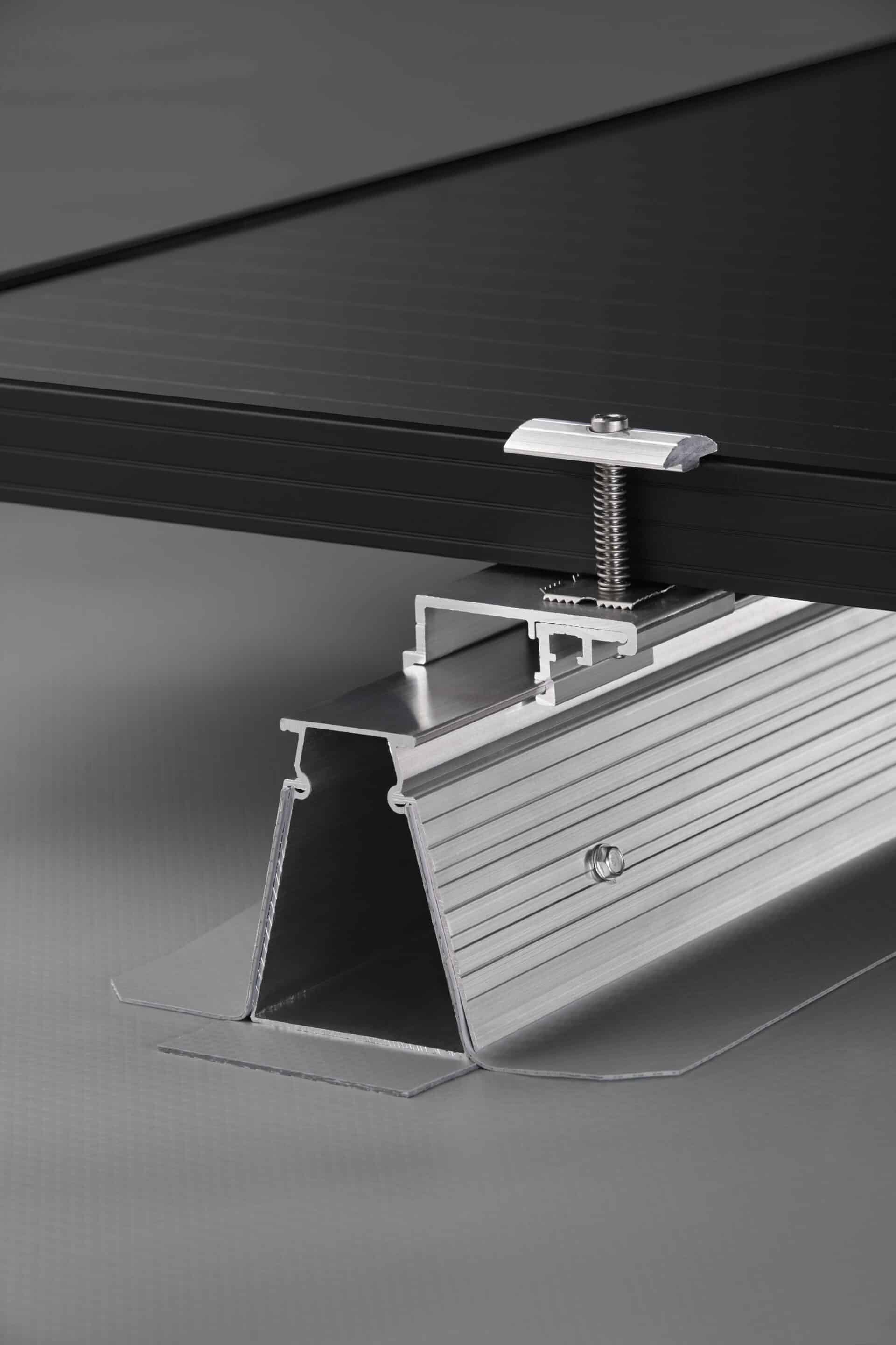 När Omega-skenorna har fästs på den bärande strukturen skjuts solcellspanelerna in i pelarna och fästs underifrån. Detta sparar installationstid (inga säkerhetsanordningar behöver installeras för arbete från takets ovansida). Dessutom skyddas solcellsmodulerna från eventuella sprickor som kan orsakas av att installatörerna går över dem. Vattentätheten säkerställs genom att vatten dräneras runt solpanelernas kanter.